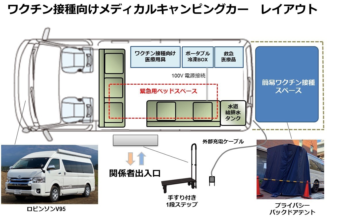 シミックソリューションズ株式会社(本社:東京都港区、代表取締役 社長執行役員 羽野 佳之、以下、シミックソリューションズ)は、本年4月下旬より東京都内の高齢者施設を対象とした「新型コロナウイルスワクチン巡回接種」サービスの提供を開始します。キャンピングカー株式会社が保有する「メディカルキャンピングカー」にて医師・看護師・運営スタッフが訪問し、現地で円滑なワクチン接種を行います。本メディカルキャンピングカーは、基本的な電源装備に加え、空調換気システムやワクチン保管用ポータブル冷凍庫、そして緊急用ベッドが備えられています。また、オーニングテントルーム※を装備しているため、対象施設内でワクチン接種の実施が困難な場合は、車内にて問診やワクチン接種を行うことも可能です。