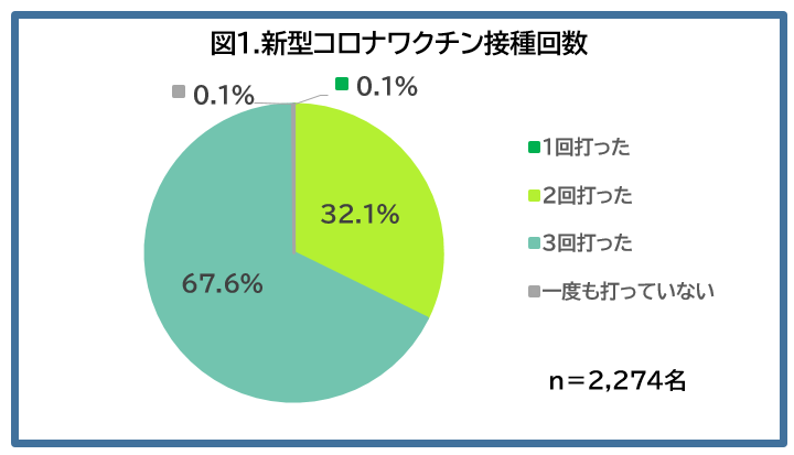 本アンケート調査にご協力いただいた方の新型コロナワクチン接種回数を聞いたところ、3回接種した方が67.6%、2回接種した方が32.1%と、99%以上の方が2回以上接種を完了していました(図1)。