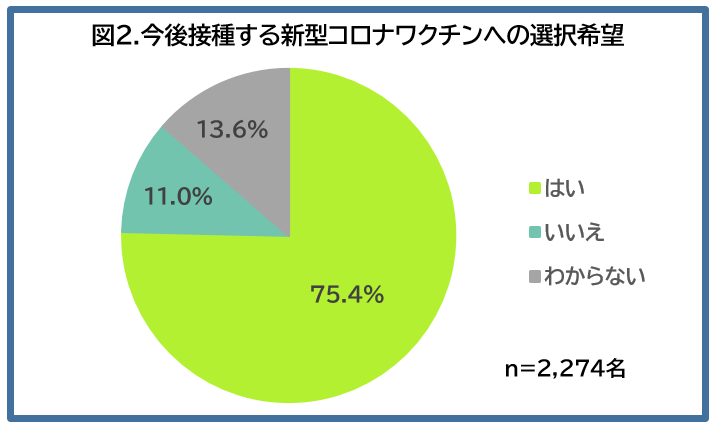 アンケート回答者2,274名のうち、今後の新型コロナワクチン接種でワクチンを自分で選びたいと回答したのは1,714名、75.4%でした(図2)。