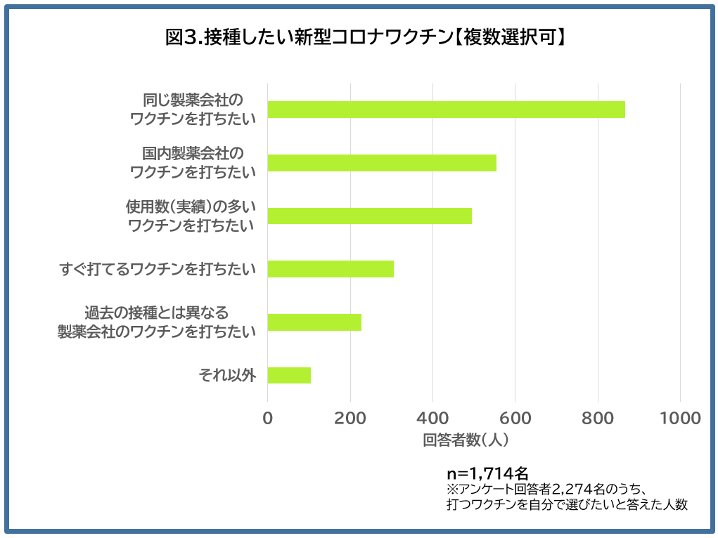 選びたいと回答した方1,714名に、選び方を複数回答可で聞いてみたところ、「同じ製薬会社のワクチンを打ちたい (回答数:865)」・「国内製薬会社のワクチンを打ちたい (回答数:555)」・「使用数(実績)の多いワクチンを打ちたい (回答数:494)」・「すぐ打てるワクチンを打ちたい (回答数:305)」・「過去の接種とは異なる製薬会社のワクチンを打ちたい (回答数:228)」となりました。(図3)。