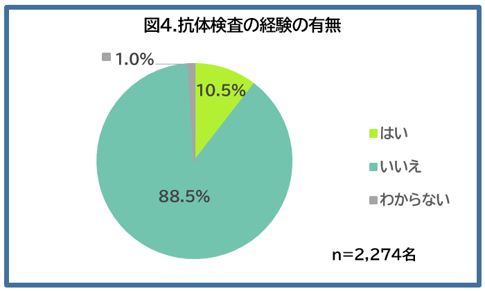 アンケート回答者2,274名のうち、抗体検査を受けたことがあると回答したのは239名、10.5%でした(図4)。