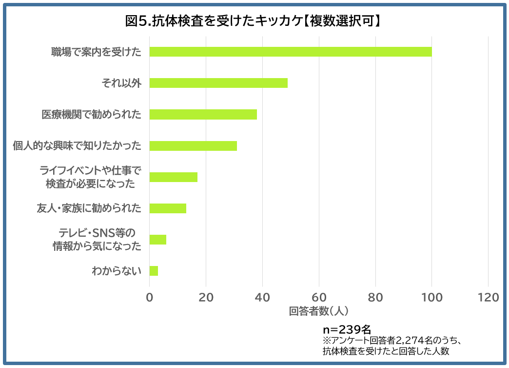 抗体検査を受けたことがあると回答した方239名に、受けたキッカケを聞いてみたところ、「職場で案内を受けた(回答数:100)」が最も多い回答となりました(図5)。