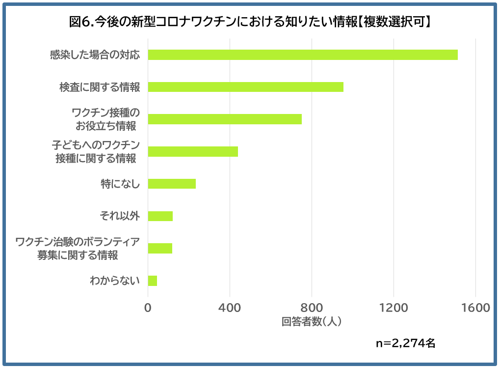 今後の新型コロナワクチンに関して知りたい情報を調査した結果、「感染した場合の対応(回答数:1511)」が最も多く、「検査に関する情報(回答数:955)」や「ワクチン接種のお役立ち情報(回答数:750)」が次に多い回答数となりました。また、「子どもへのワクチン接種に関する情報(回答数:439)」、「ワクチン治験のボランティア募集に関する情報(回答数:120)」を知りたい方もいることが分かりました(図6)。