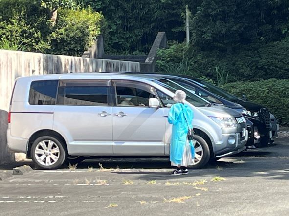 富士宮市在住で発熱などの症状がある方(以下:対象者)を対象に、インターネットまたは電話にて予約し、自家用車で配布センターに来場いただきます。対象者は配布センター内の駐車場に駐車し、防護服を着用したスタッフによるご本人確認を経て、検査キットを受け取ります。対象者は自家用車から降りることなく、配布スタッフとの最小限の接触でより安全に検査キットを受け取ることが可能です。