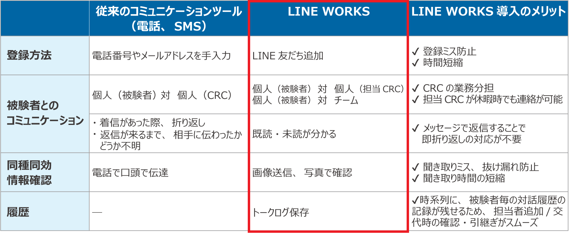 シミックヘルスケアでは、2019年8月よりLINE WORKSを導入し、社内のコミュニケーションツールとして活用してきました。LINE WORKSは、国内で広く普及しているLINEと唯一接続できるビジネスチャットであり、被験者との新たな連絡手段として、臨床試験にも活用するための検討と準備を重ねて参りました。