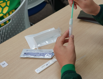 そこで、シミックでは同部に所属する高校生106名を対象に、シミックが販売する新型コロナウイルス抗体検査キット「SARS-CoV-2 唾液抗体テスト」(研究用試薬、以下:本キット※)を用いて、抗体量を一括して計測する「集団測定会」を初めて開催しました。本キットは、唾液を採取してキットに表示されたラインスコアの濃淡で抗体量を高中低で目視できるもので、約15分で結果が判明する簡便なキットでありながら、米国で唯一 FDA(米国食品医薬品局) の承認を取得しております。