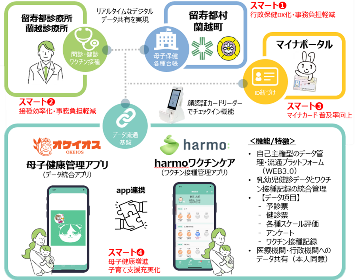 小児ワクチンの接種記録は、シミックグループが持つワクチン接種記録管理アプリ「harmo(ハルモ)ワクチンケア」を使用します。harmoワクチンケアは、2021年12月に留寿都村診療所に導入いただき、地元住民の方々のワクチン接種管理に活用いただいています。また、母子健康管理アプリは、シミックと資本業務提携を締結している株式会社オケイオス(本社:福岡県福岡市、代表取締役社長 中村 高歩、以下:オケイオス)が開発したデータ統合アプリを活用します。本システムに用いるアプリは医療機関や健診実施機関が入力したデータを活用することから、保護者自ら手入力することが必要な他アプリと比べ、信頼性が高いことが特徴です。更なるデータの正確性を担保するため、マイナンバーカードを用いた本人確認、同意、転入時の過去情報の取得等も行う予定です。本母子健康管理アプリは、福岡大学の永光教授が福岡県福岡市西区で進めてきた実証事業により開発されたノウハウを活用しています。これらの2つのアプリを連携し、データ流通基盤として整備し、保護者・医療機関・自治体と、3者のリアルタイムなデータ共有を実現します。