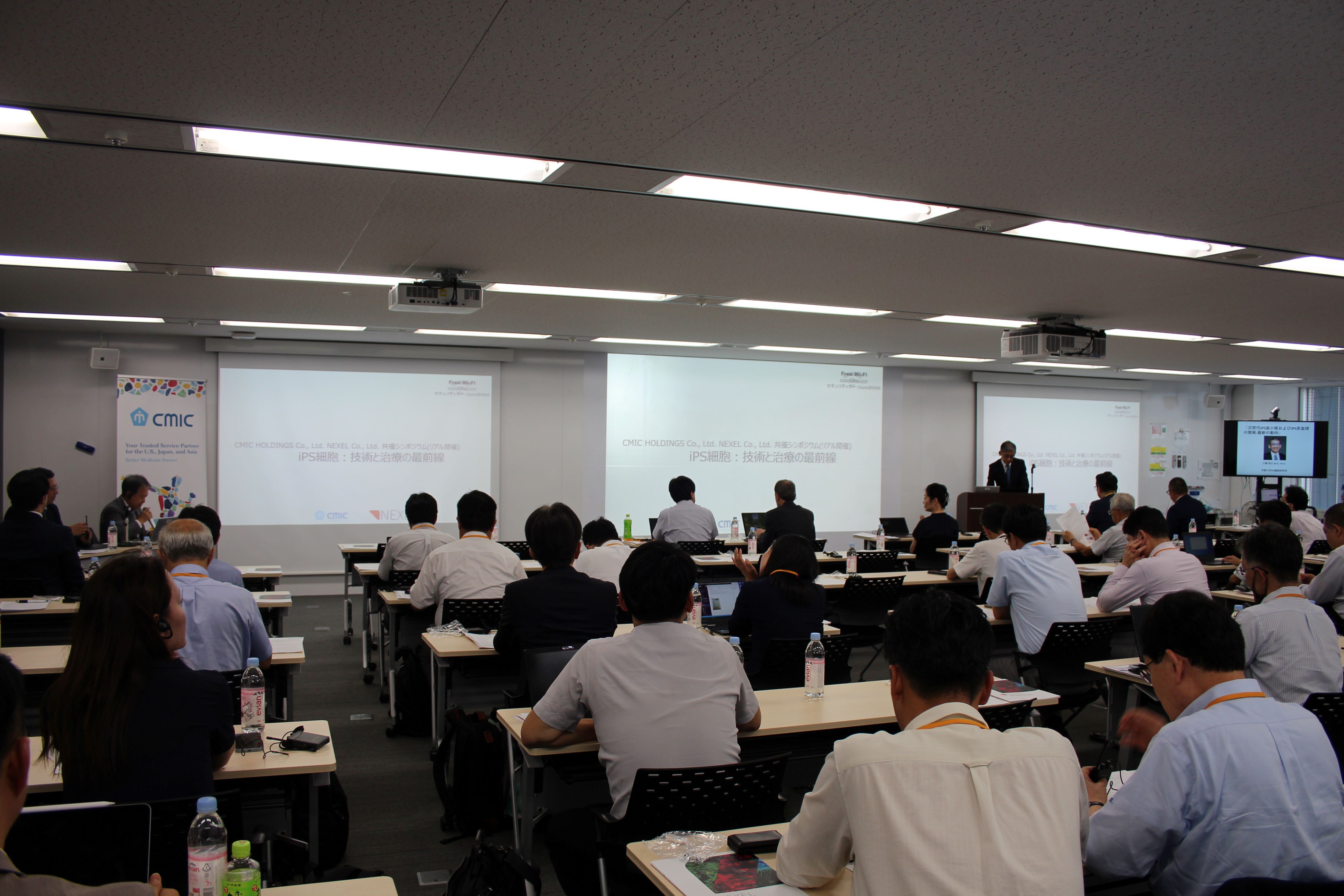 今回のシンポジウムは、「iPS細胞:技術と治療の最前線」と題し、iPSC技術分野における世界的なリーダーであるNEXELとの共催で行われました。このシンポジウムでは、研究者・研究開発企業の皆様の専門的知識の修得および研究開発能力の向上を目的に、iPS細胞技術の最新動向と倫理、ガイドラインと標準化の2つのセッションで構成し、京都大学iPS細胞研究所の江藤浩之先生と藤田みさお先生、英国Glasgow大学のGodfrey Smith教授、日本国立医薬品食品衛生研究所の諫田泰成先生に、それぞれご講演いただきました。また、シミックCEO中村とNEXELハンCEOも出席し、関係者との交流を図りました。