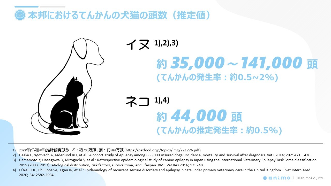 獣医療において、てんかんの犬猫はおよそ20万頭ほど(推定値)いると言われています。てんかん治療においては、オーナーの日常の記録がどれだけ正確に取得されているかが適切な診断や治療のために重要な要素となるとともに、それらの情報を適切にかかりつけ医や専門医に連携する仕組み作りが必要となります。ヒト医療のてんかん領域におけるシミックグループのノウハウを基盤として開発するシステムを、アニコムグループの持つペットオーナー、動物病院間のネットワークを活用して展開することで、本邦の獣医療におけるてんかん治療の発展を目指しています。