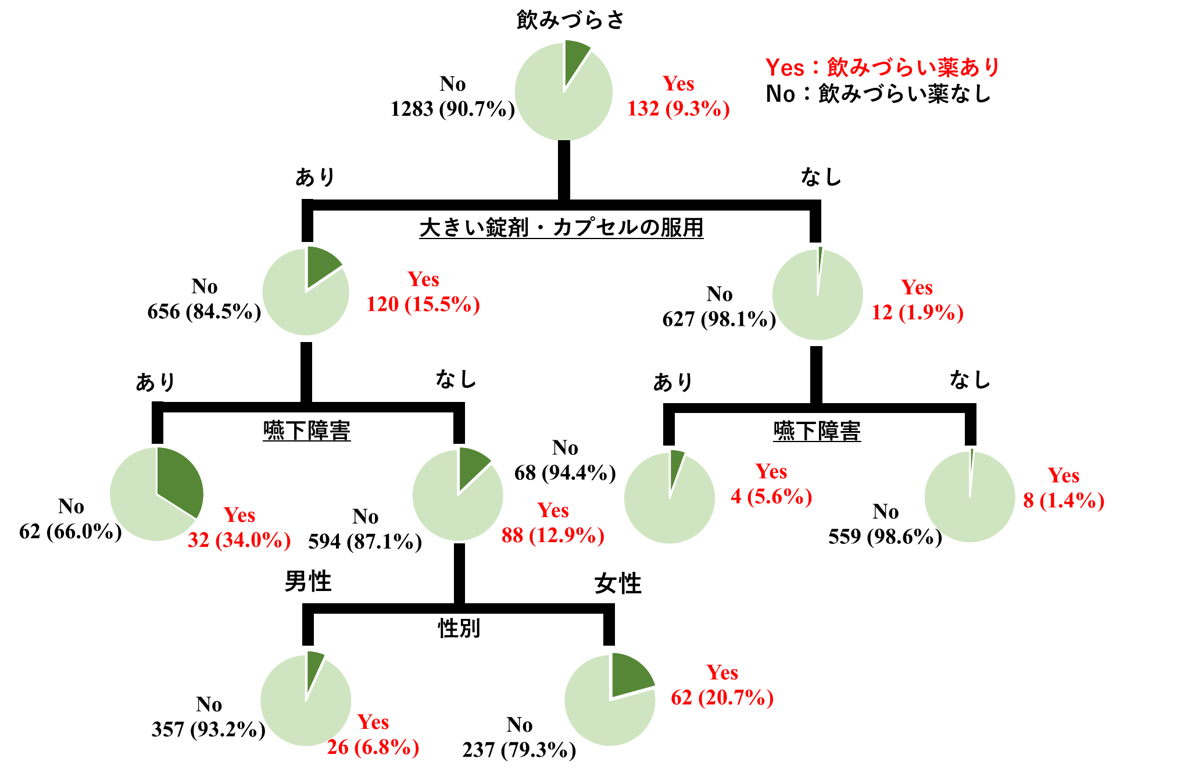 有効回答は1,501 名であった(飲みづらい薬あり:212名)。大きくて飲みづらいと回答のあった薬のうち、製剤情報が特定できた147剤を対象に解析した結果、患者が飲みづらい薬剤の大きさの最適な指標は「長径+短径+厚さ」であり、その閾値が21.5 mmであることが明らかとなりました。多変量解析の結果,50 歳未満,女性,嚥下障害,大きい錠剤・カプセルの服用(「長径+短径+厚さ」が 21.5 mm 以上)が飲みづらいリスクを上げる要因として抽出されました。また、決定木分析では、大きい錠剤・カプセルの服用があり、かつ嚥下障害を有する患者が最も高リスクである(飲みづらい回答割合:34.0%)ことが示され、両者の要因を持つ患者に服用を容易にする措置やアドバイスの必要性を考慮すべきと考えられました。