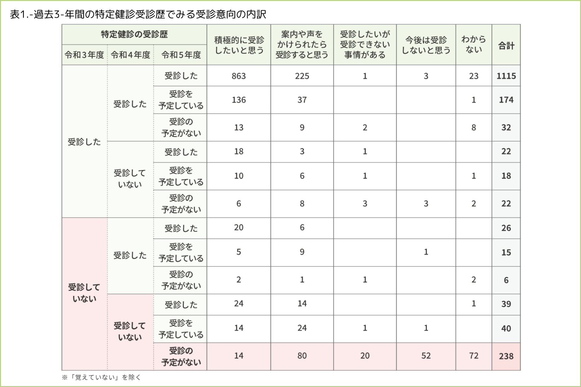 過去3年連続で特定健診を受診してない方238人のうち、「案内や声をかけられたら受診すると思う」と回答した方が33.6%(80人)と、3人に1人は何らかの勧奨が受診行動につながる可能性があることが示唆されました。