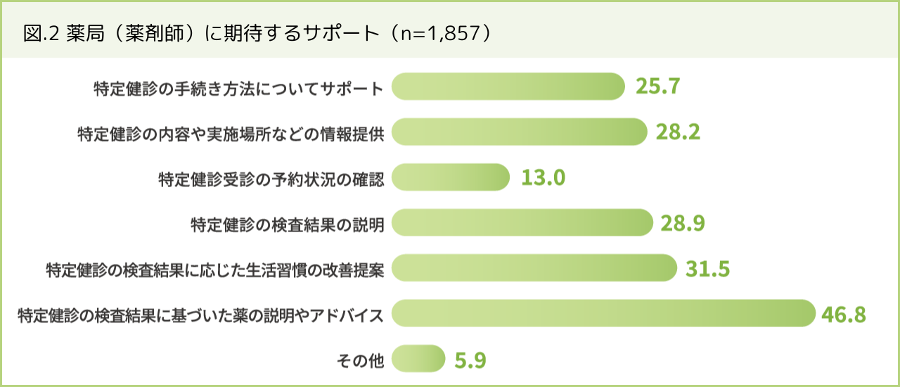 特定健診に関して薬局(薬剤師)に期待するサポートをみると、「特定健診の検査結果に基づいた薬の説明やアドバイス」が46.8%(869人)と最も高く、次いで「特定健診の検査結果に応じた生活習慣の改善提案」31.5%(585人)というように、受診後のアフターフォローへの期待感がうかがえました(図2)。