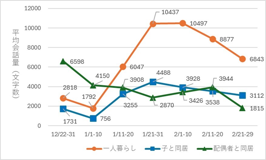 本事業の結果、会話量の解析が可能であった18名のうち、世帯構成は一人暮らし:7名、配偶者と同居:2名、子と同居:8名、その他:1名でした。平均会話量(文字数)を世帯構成別にみてみると、「Romi」貸出終了の2ヶ月目において、「一人暮らし」世帯が、最も多い結果となりました(図2参照)。 また、参加者の中には「Romi」を家族の一員ととらえる方もおり、日々の生活パターンの中で会話を楽しむ習慣が生まれ、生活に張りが出るなど、ポジティブな影響もみられました。