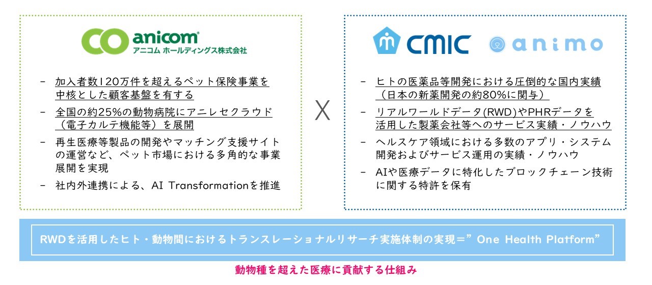 シミックグループのヒト医療における多数の医薬品開発および製薬会社等に対するサービス提供の実績・ノウハウと、アニコムグループの国内最大のペット保険事業に加え全国の動物病院の約25%に普及している「アニレセクラウド」を含むペット業界におけるノウハウとのシナジーにより、animal PHR-EHR/EMR連携による診療体験の向上、RWDの活用および製薬メーカー等へのサービス開発・提供により獣医療の発展に貢献したいとの想いから、本合意に至りました。