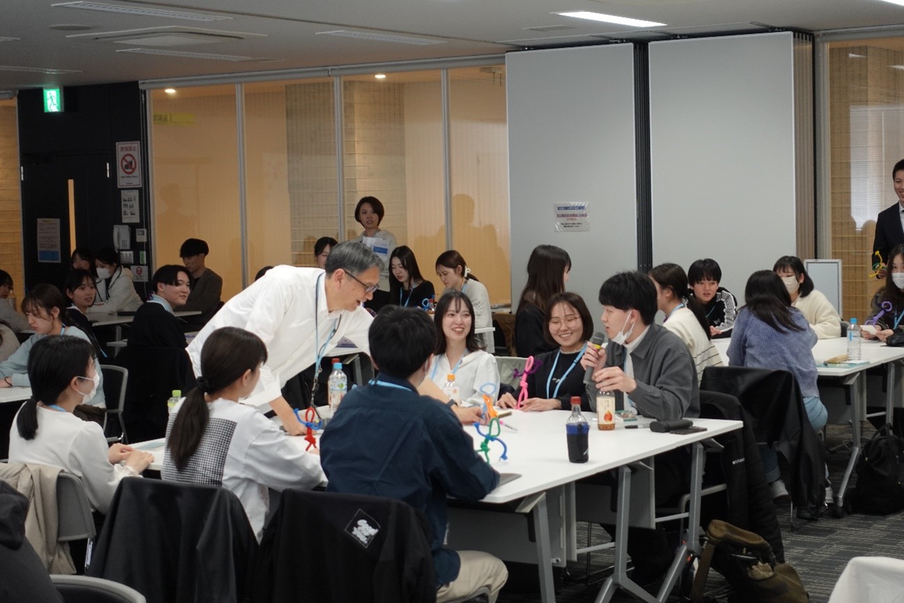 まず、アイスブレークとして二本の紐を使って人型を作るアートワーク「HIMONINGEN(ヒモニンゲン)」をそれぞれが制作し、合宿への意気込みを人型ポーズで表現してもらいました。 その後「10年後のヘルスケアを考える」というテーマの元、課題解決に向けた提案を完成させるために、チームごとにディスカッションを重ねました。