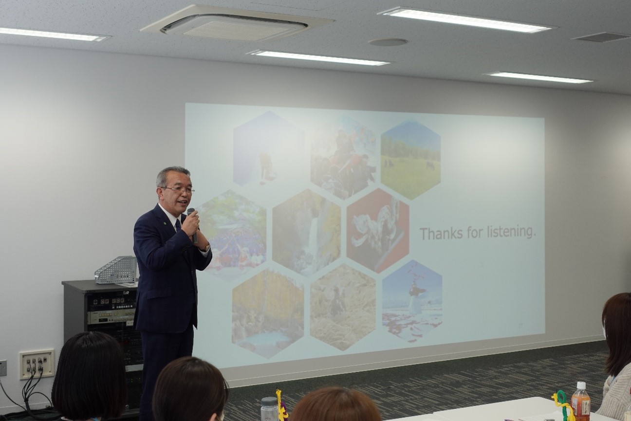 研修の冒頭には、妙高市長 城戸陽二様より新入社員に向けた講話をいただき、これまでの妙高市と当社グループの取り組みについてご説明いただきました。