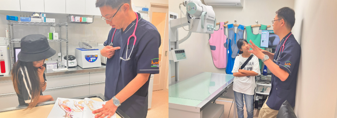 動物病院では、診察室やレントゲン室、エコーの機械までひとつひとつを見学。獣医師の先生からお話を聞いて、実際に聴診器でわんちゃんの心臓の音を聞いてみたり、顕微鏡をのぞいたりして、お仕事体験をしました。