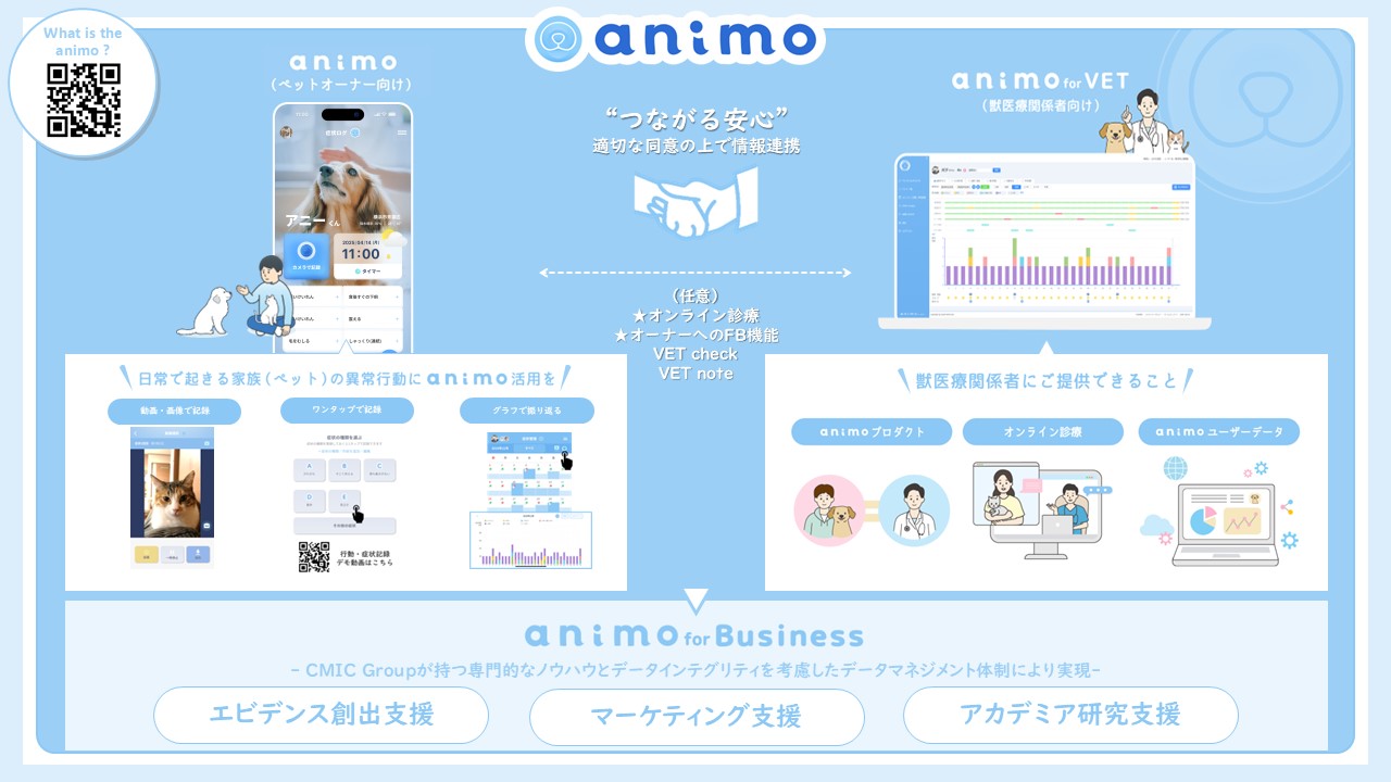 シミックホールディングス株式会社(本社:東京都港区、代表取締役社長 大石 圭子、以下、シミック)のグループ会社であり、人と動物の垣根を超えたヘルスケア・エコシステムの構築(One Health Platform)を目指しアニマルヘルスケア領域の事業を展開するanimo株式会社(本社:山梨県北杜市、代表取締役COO 栗田 敦志、以下、animo)は、animo platform(animo owner app & animo for VET)を活用したエビデンス創出支援/データサービス事業を開始したことをお知らせします。