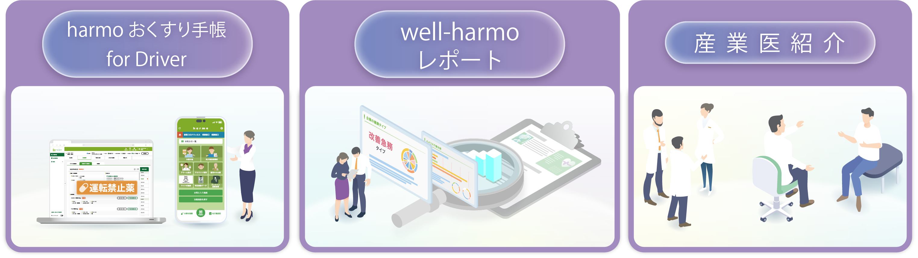 harmoおくすり手帳の活用で、従業員の服薬管理と治療の継続を支援し、健康に起因する事故の防止を目指します。服薬忘れや治療中断、眠気などの副作用によるリスクを減らし、治療中でも運転業務を続けられるようサポートします。