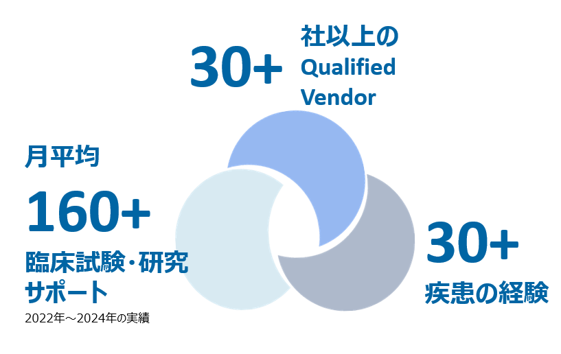 治験薬等保管倉庫会社、治験薬等輸送、薬剤包装及びラベリング、ECG、ePRO、ウェアラブルデバイス、Imaging、臨床検査会社、機器医薬品等卸業者、製造販売元リース会社、校正会社などの幅広いサービスプロバイダー管理の実績を有しており、お客さまの試験・研究に最適なサービスプロバイダーを選択することが可能です。