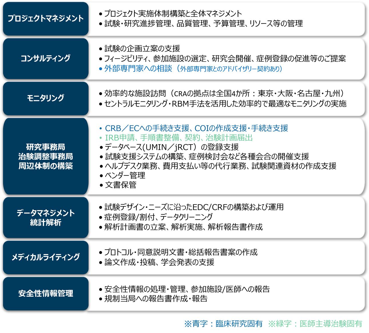 - 医師主導治験の運営に精通した調整事務局業務経験と、疾患領域に精通したモニタリング知見を融合することで、質とスピードの両立を実現し、調整医師の最良のパートナーとして、治験成功を全力で支援します。