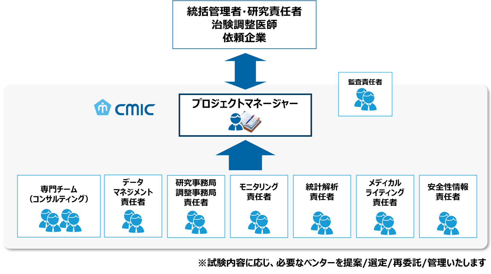 - 最新の知見と豊富な現場経験を併せ持つ専門家チームが、マネジメント力とコンサルティング力を活かし、医師の持つアイディアを治験計画として具体化、成果へつなげるまで一貫して支援します。
