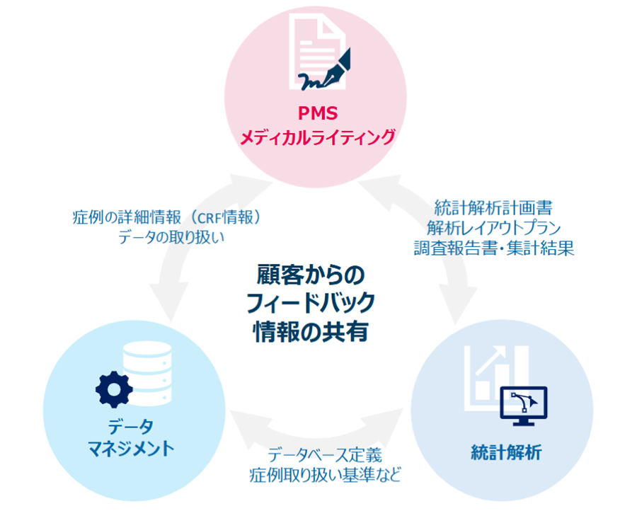 PMSメディカルライティングチームは、統計解析、データマネジメントの各部門と密に連携し、内容や方向性を適切に共有・確認することで、質の高い文書を効率よく作成します。シミックへの一括委託により、お客さまの業務を大幅に軽減できます。