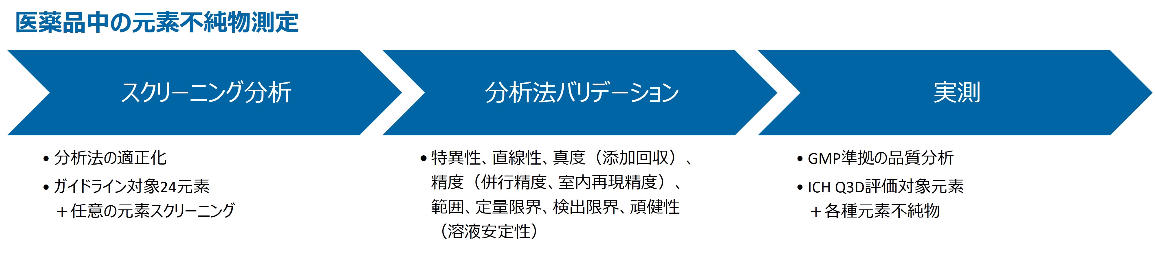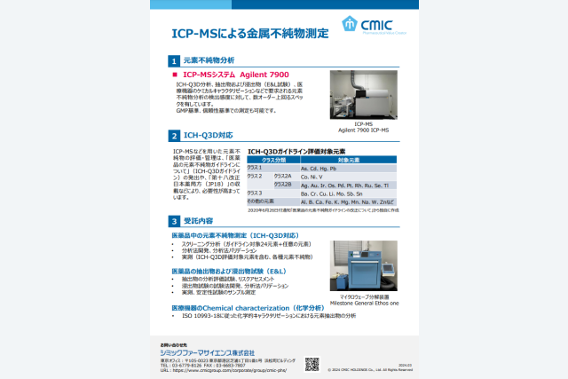 誘導結合プラズマ質量分析法(ICP-MS)を用いた元素不純物の評価・管理は、ICH Q3Dガイドラインの発出や、日本薬局方への収載などにより、その必要性が高まっています。シミックはICP-MSの測定装置を所有しており、ICH Q3D対応をはじめ各種測定に対応が可能です。