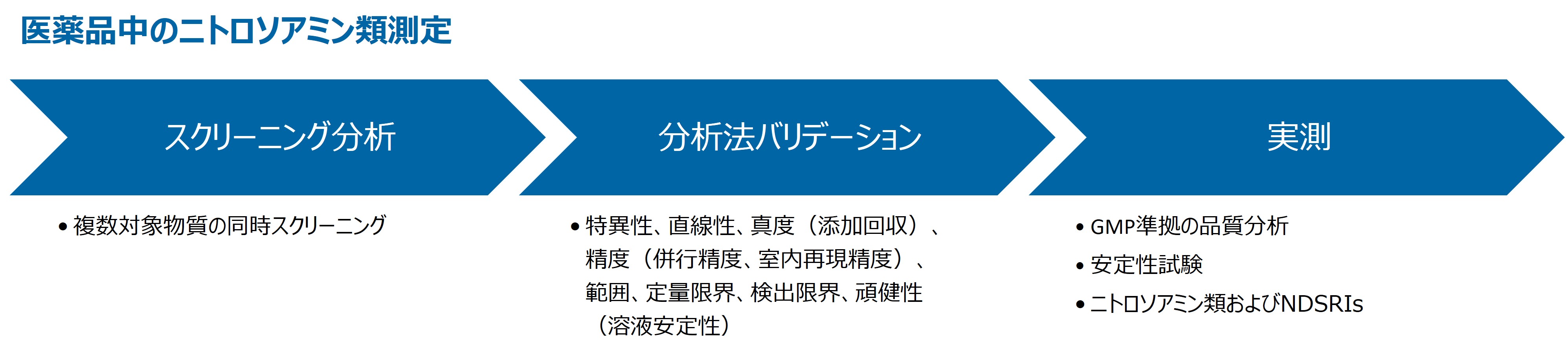 NDMA(N-ニトロソジメチルアミン)、NDEA(N-ニトロソジエチルアミン)など厚生労働省が指定する9種類のニトロソアミン類だけではなく、新たな混入経路として注目されているニトロソアミン原薬関連不純物(NDSRIs:Nitrosamine Drug Substance-Related Impurities)まで、多数の測定実績があります。