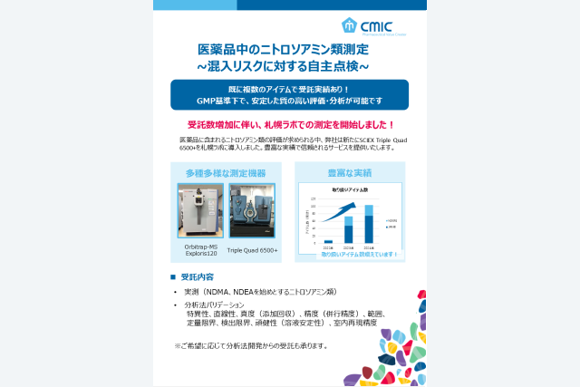ニトロソアミン類や元素不純物など、医薬品の開発・製造における不純物の測定に関し、規制当局による通知の発出やガイドラインの策定など、そのリスク管理の重要性が高まっています。 シミックでは不純物測定の豊富な実績を生かし、設備の充実に取り組んでいるほか、多様な測定オプションを組み合わせ、不純物測定を多角的にサポートします。