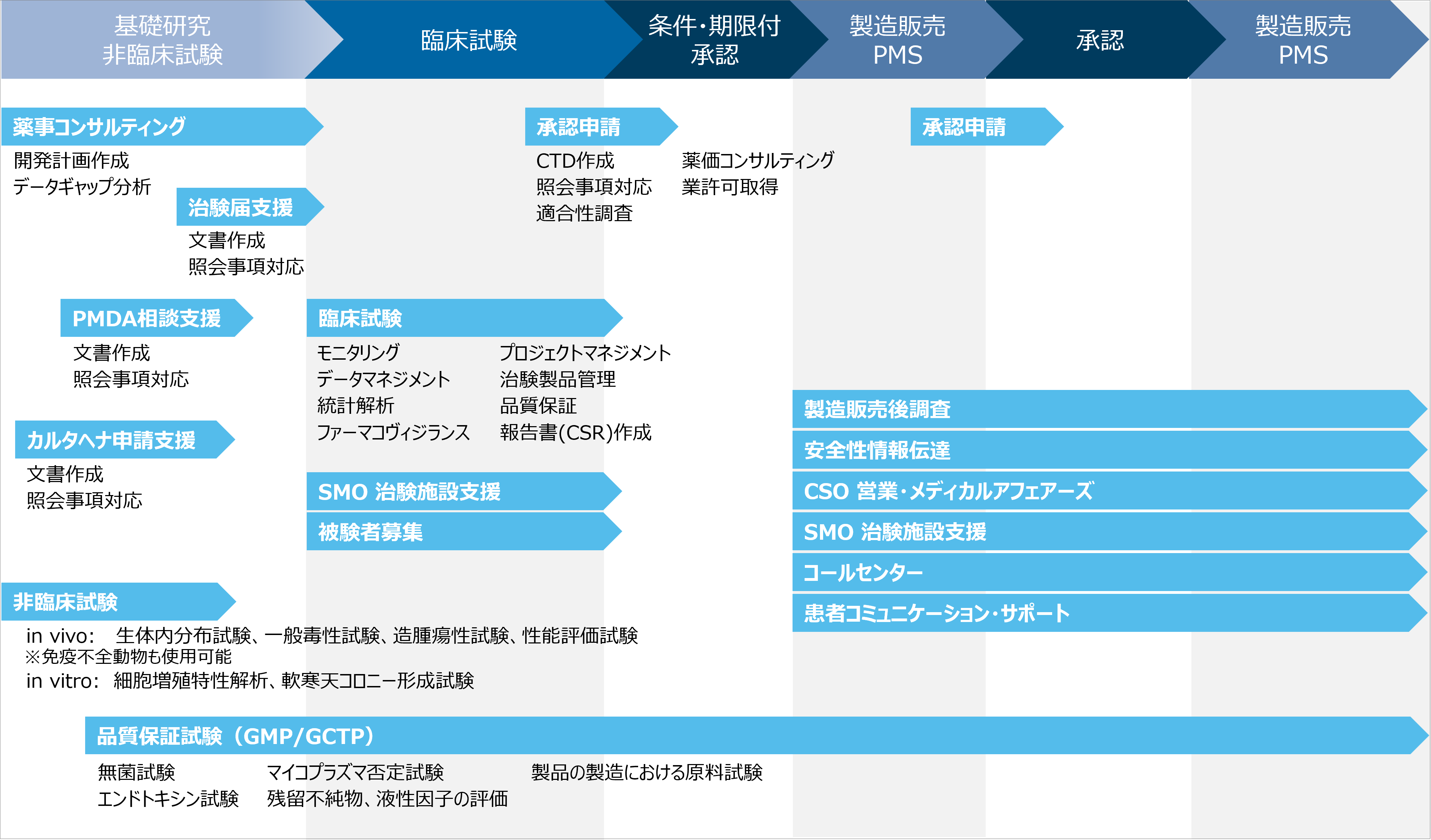 再生医療等製品の初期開発から上市後までをシームレスにサポートします。コンサルティング、プロジェクトマネジメント、モニタリングのほか、In Country Clinical Care-taker(ICCC:治験国内管理人)としての対応も可能で、開発戦略の立案から非臨床試験、施設調査、承認申請後の監査サポートまで、幅広く対応しております。また、企業治験のみならず、医師主導治験についてもサービス提供を行っています。
