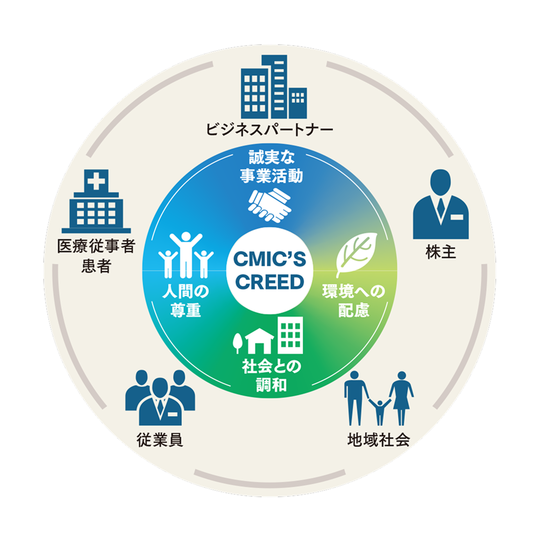 シミックグループの企業理念である「CMIC’S CREED」は、サステナビリティに対する基本的な考え方を示しています。
