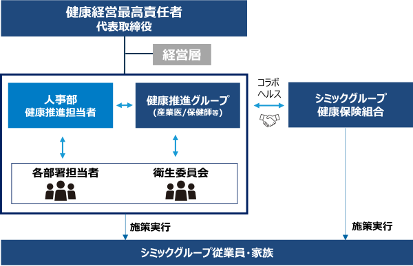 当社は、最高責任者である代表取締役からの健康宣言のもと、健康推進グループを中心とし、健康経営を推進しています。健康保険組合との連携(コラボヘルス)だけでなく、人事関連部門・衛生委員会等とも連携し、施策の計画、実行、見直しを行うことで健康経営の継続的改善を図っています。
